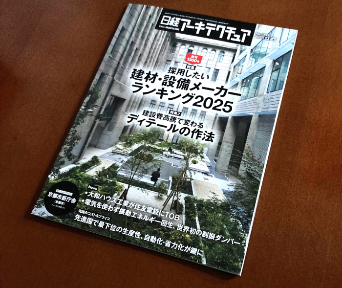 このたび「日経アーキテクチュア」(2025年11月27日号)の「採用したい建材・設備メーカーランキング2025」において、当社製品が意匠面と機能面の評価を受け、昨年に引き続き今年も上位10社に選ばれました。